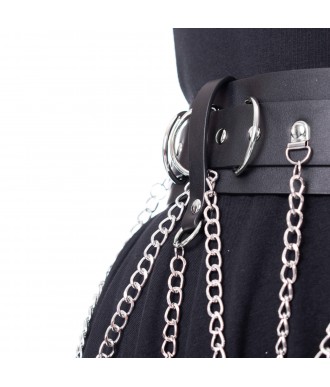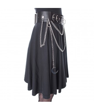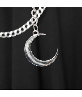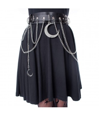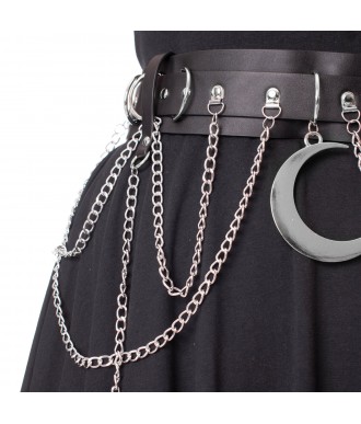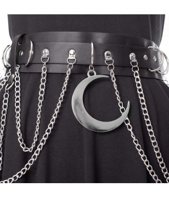 Dwuwarstwowy pasek ozdobiony licznymi łańcuchami przykuwa wzrok, a jednocześnie daje przestrzeń dla środkowego, najważniejszego elementu - wielkiej zawieszki w kształcie księżyca.