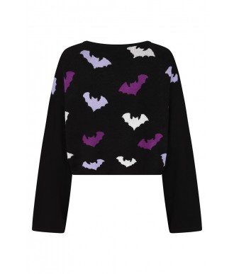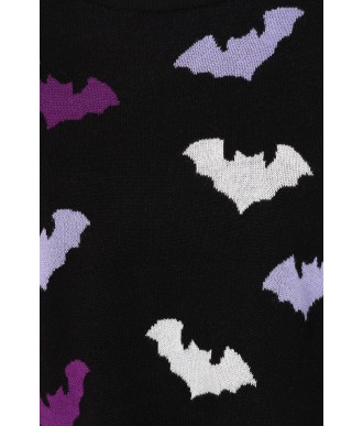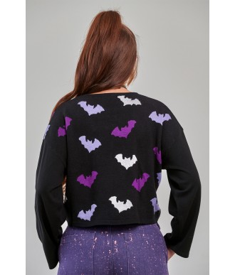 Ten krótki sweter z miękkiego czarnego materiału łączy mroczny, halloweenowy klimat z uroczym stylem kawaii. Ozdobiony motywem nietoperzy w odcieniach bieli, bzu i fioletu przyciąga wzrok kontrastem i wyrazistością. Jego luźny krój z lekko opadającymi ramionami i skróconym dołem tworzy modną, swobodną sylwetkę i jest doskonałym wyborem do codziennych, wygodnych stylizacji. Długie rękawy i okrągły dekolt zapewniają wygodę noszenia.