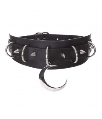 Zastosowany z przodu dodatkowy pasek skóry jednocześnie chroni szyję przed dyskomfortem oraz dodaje dynamiki budując kontrast między cienkim zapięciem, a ciężarem ćwieków i srebrnego księżyca.