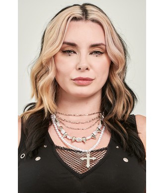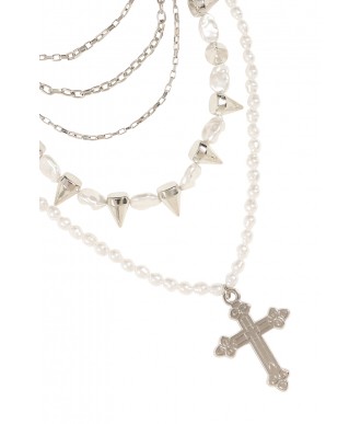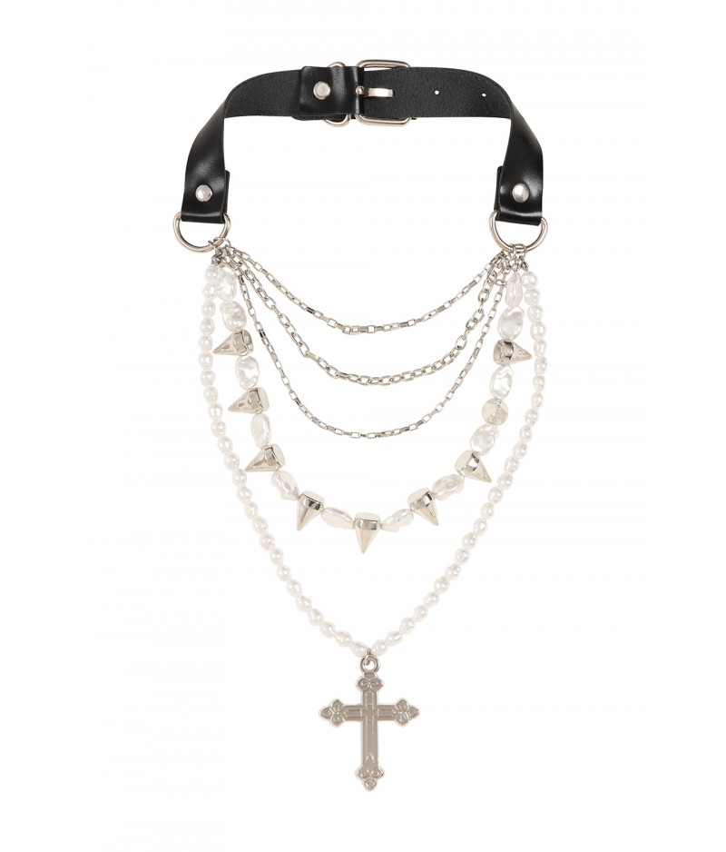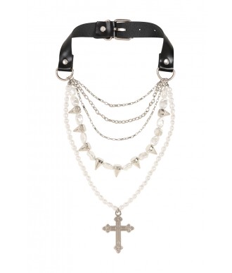 Naszyjnik Divine Edge łączy w sobie eleganckie perły, ostre kolce, warstwowe łańcuszki oraz wyrazisty wisiorek w kształcie krzyża, tworząc efektowną, przyciągającą wzrok biżuterię. Zapinany na regulowanym czarnym pasku, naszyjnik ten łączy w sobie gotycką elegancję z punkowym charakterem. Idealnie nadaje się do dodania charakteru i stylu do alternatywnych stylizacji.
