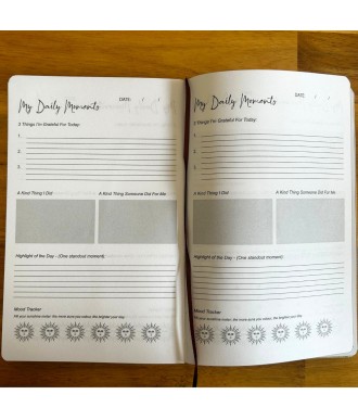 W środku masz 120 stron wysokiej jakości papieru, na których zapiszesz swoje myśli, afirmacje i powody do wdzięczności. Regularne korzystanie z dziennika pomaga budować pozytywne nastawienie, zwiększa samoświadomość i wspiera dobre samopoczucie.